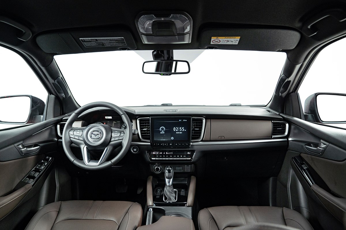 Nếu như bán tải trước đây gắn liền với hình ảnh nội thất thô ráp thì BT-50 thế hệ mới mang đến trải nghiệm khác biệt hoàn toàn. Nội thất xe được phối hai tông màu nâu và đen sang trọng với ghế ngồi và ốp cánh cửa bọc da màu nâu được khâu bằng các đường chỉ tỉ mỉ. Một số chi tiết màu bạc điểm xuyết tạo sự tương phản và mang đến cảm giác sang trọng hơn. Vô-lăng và cần số cũng được bọc da mềm.